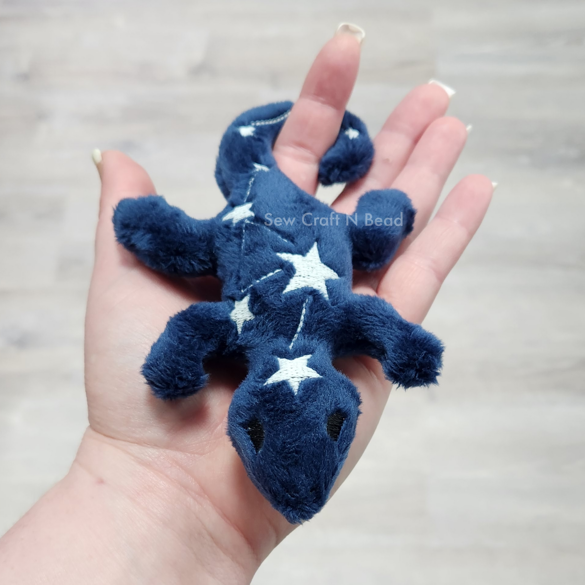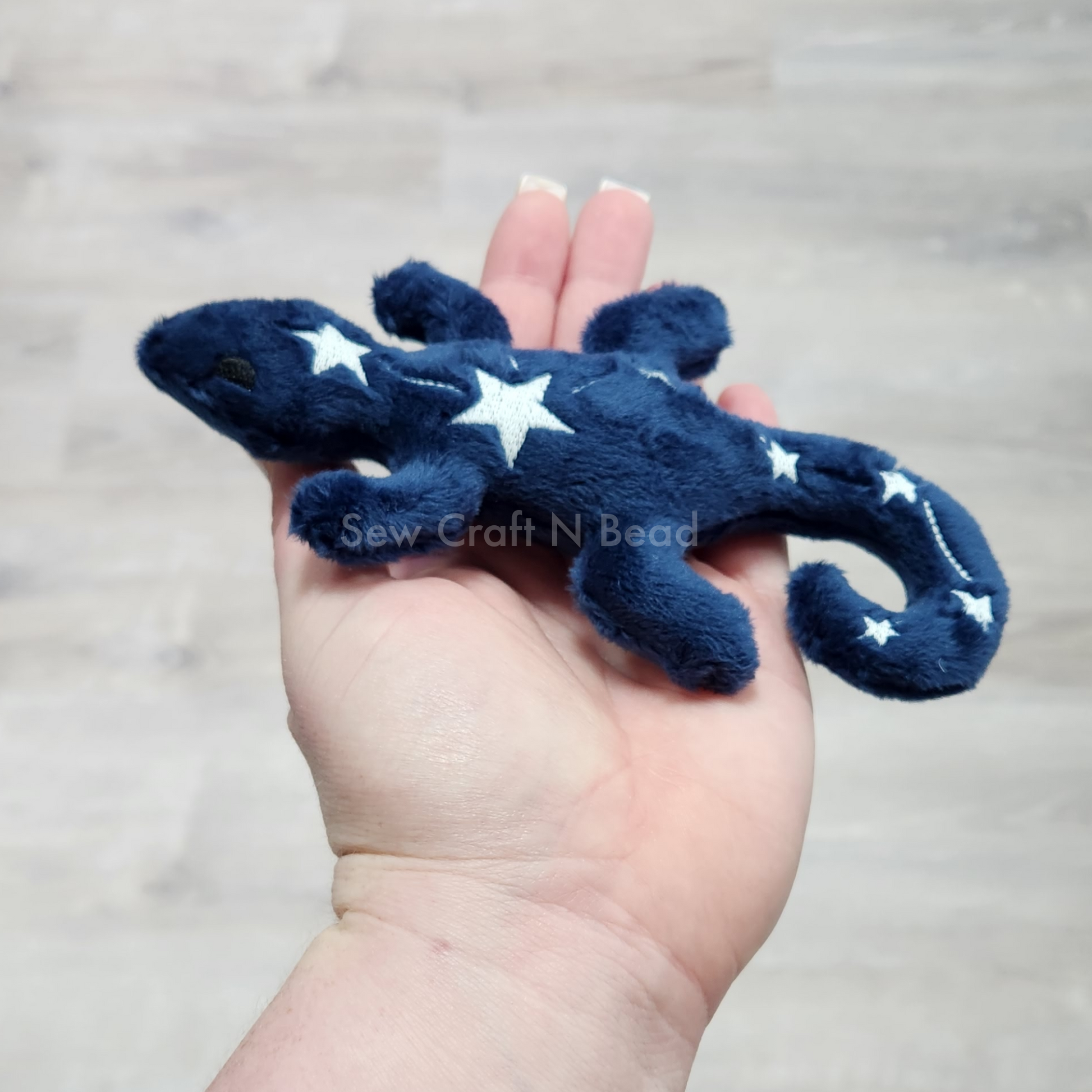 The lizard measures approximately 6.5 inches long and 4 inches wide. Perfect size to carry around!
